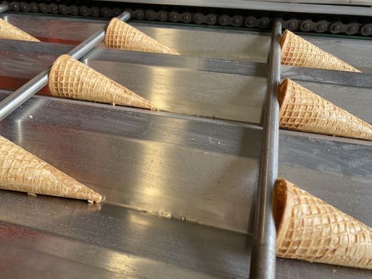 This ice cream cone maker is used for rolling cones. It provides the cone for the next process to fill the ice cream. First, it distributes the batter onto the pans to prepare the wafers for forming, then rolls them up, holds them in shape, and transfers them to a food-grade conveyor. Excellent performance enables us to easily meet international standards.